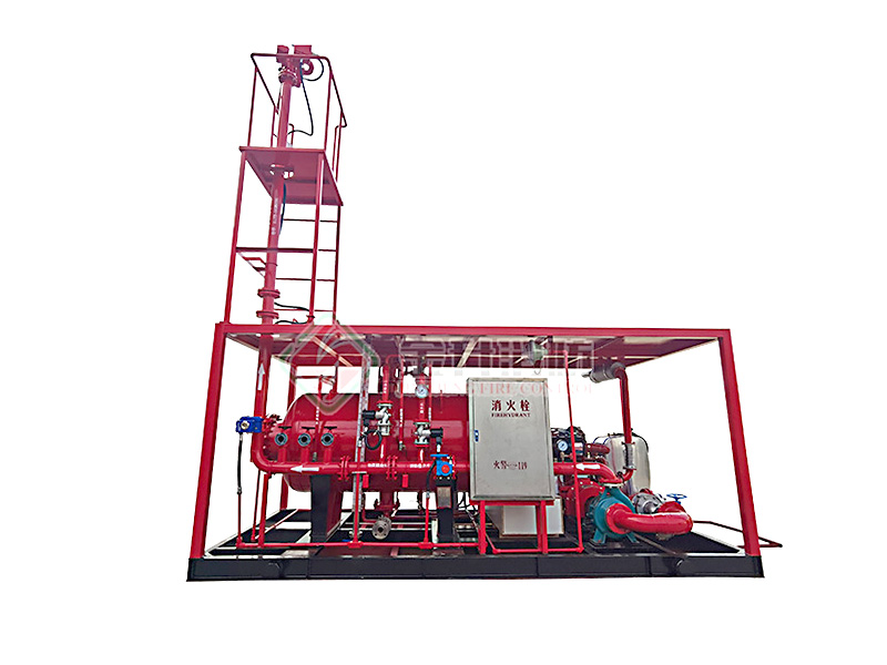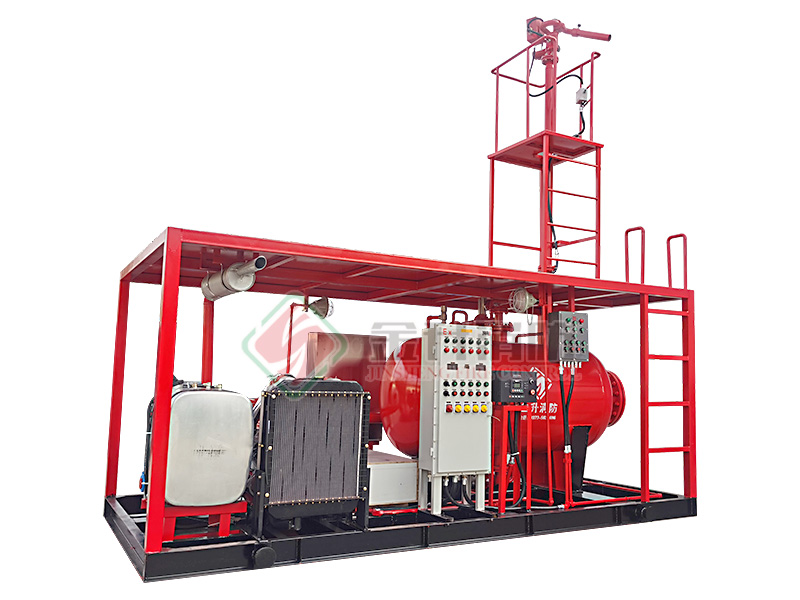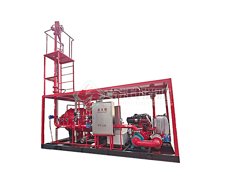撬裝泡沫滅火裝置主要柴油機(電動機)消防泵組、壓力式比例混合裝置(或泡沫液儲罐)、噴射系統(tǒng)(防爆電動消防炮)、公共底座、防雨棚、操作平臺及爬梯、防爆控制柜、消防器材箱、消防水帶、泡沫槍與連接管路等組成。機組采用柴油機(或電動機)為動力。